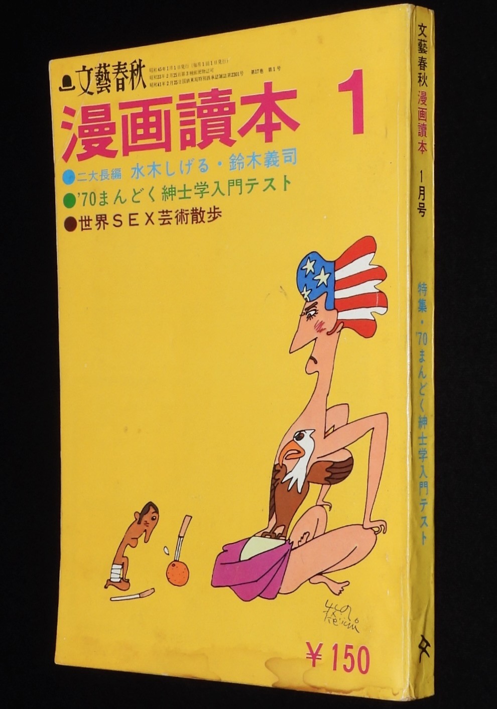 「文藝春秋 漫画読本 昭和45年1月号」 Posted on 2025年4月23日 by 太田 諭 本日の一品は「文藝春秋 漫画読本 昭和45年1月号」 https://auctions.yahoo.co.jp/jp/auction/c1182055632 「水木しげる:群衆の中に」 「サントリー名作漫画劇場/島田啓三:冒険ダン吉」 昭和45年は、大阪万博で沸いた年でしたね、な一品。 #本日の一品 (ヤフオク出品商品の紹介です)