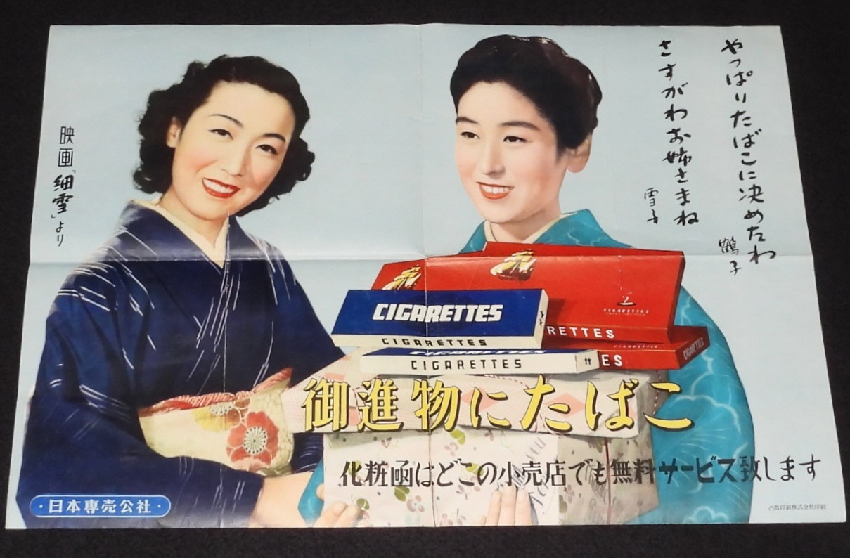 「【たばこポスター】御進物にたばこ 映画 細雪 鶴子/雪子 昭和25年頃」 Posted on 2025年9月24日 by 太田 諭 本日の一品は「【たばこポスター】御進物にたばこ 映画 細雪 鶴子/雪子 昭和25年頃」 https://auctions.yahoo.co.jp/jp/auction/v1201323080 「化粧函はどこの小売店でも無料サービス致します」 花井蘭子と山根寿子らしいですが、どちらも知らないっす、な一品。 #本日の一品 (ヤフオク出品商品の紹介です)
