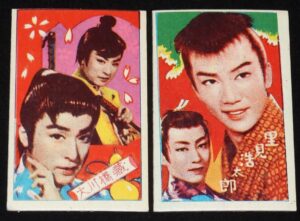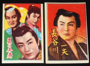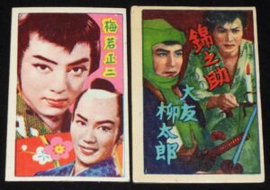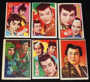 本日の一品は「【駄玩具】実写版角面子 大川橋蔵/里見浩太郎 ほか 6枚セット 昭和30年代頃」