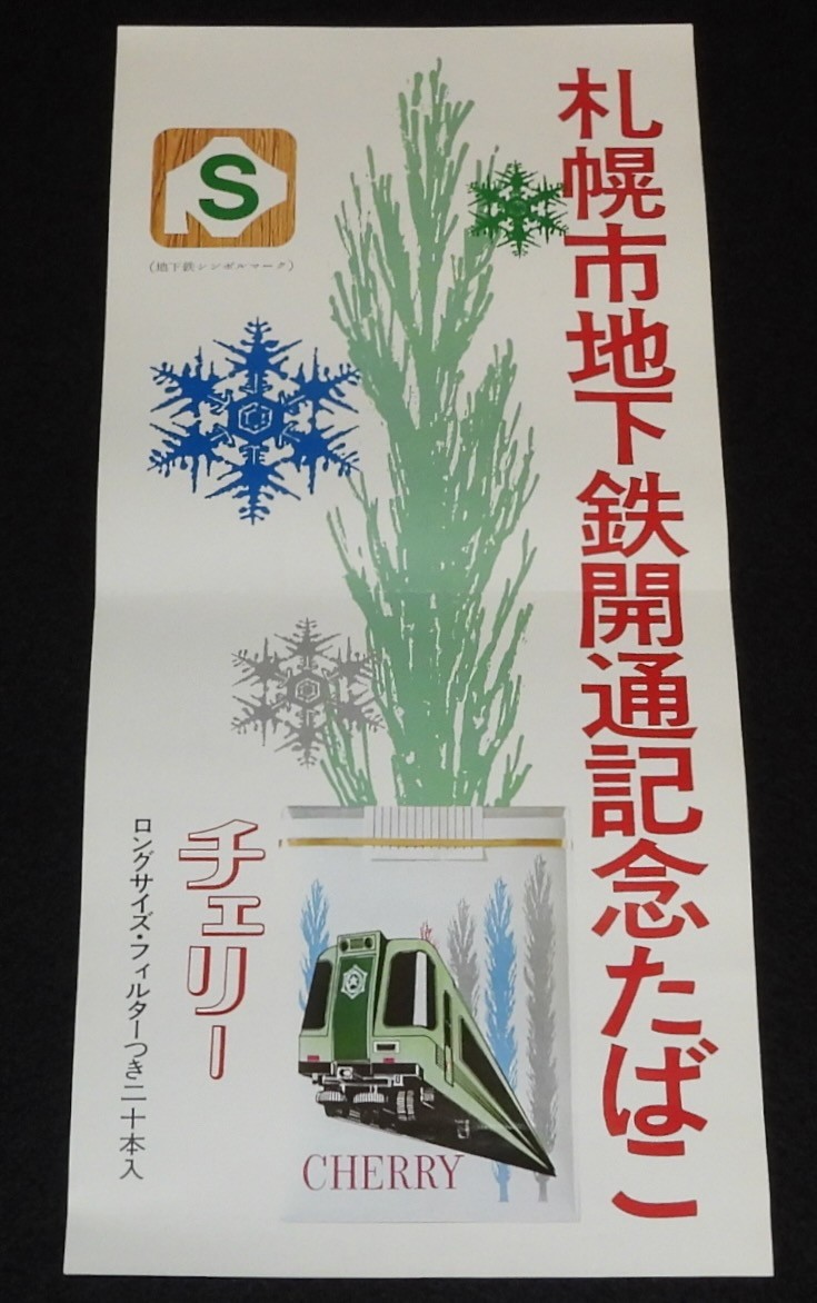「【たばこポスター】札幌市地下鉄開通記念たばこ 昭和46年」 Posted on 2025年12月3日 by 太田 諭 本日の一品は「【たばこポスター】札幌市地下鉄開通記念たばこ 昭和46年」 https://auctions.yahoo.co.jp/jp/auction/k1210088922 「チェリー/ロングサイズ/フィルターつき20本入」 「日本専売公社」 札幌オリンピックの3ケ月前でした、な一品。 #本日の一品 (ヤフオク出品商品の紹介です)