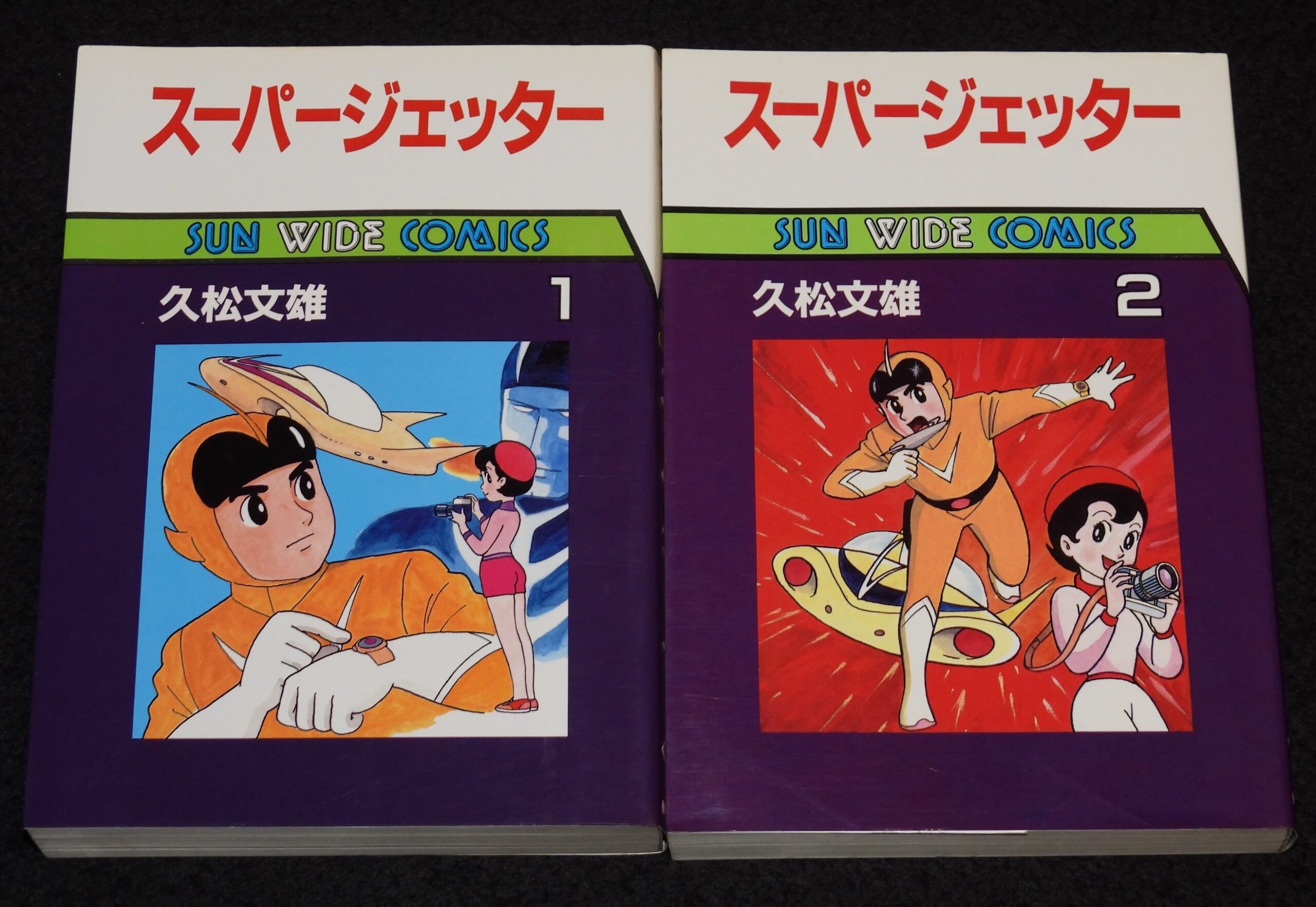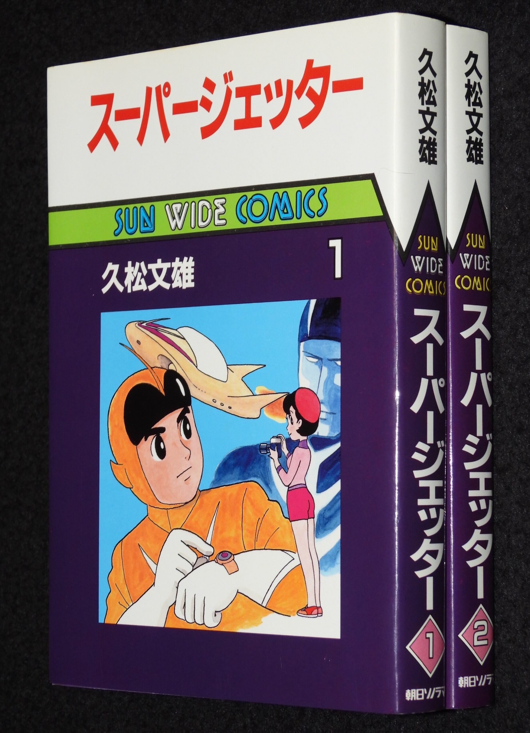 久松文雄 スーパージェッター 全2巻 朝日ソノラマ・サンワイドコミックス 昭和60年9月~初版 B6判. ■状態■並 カバー少汚れシミ、端少痛み、本文端少折れ目、小口少ヤケシミ、2巻天印あり.