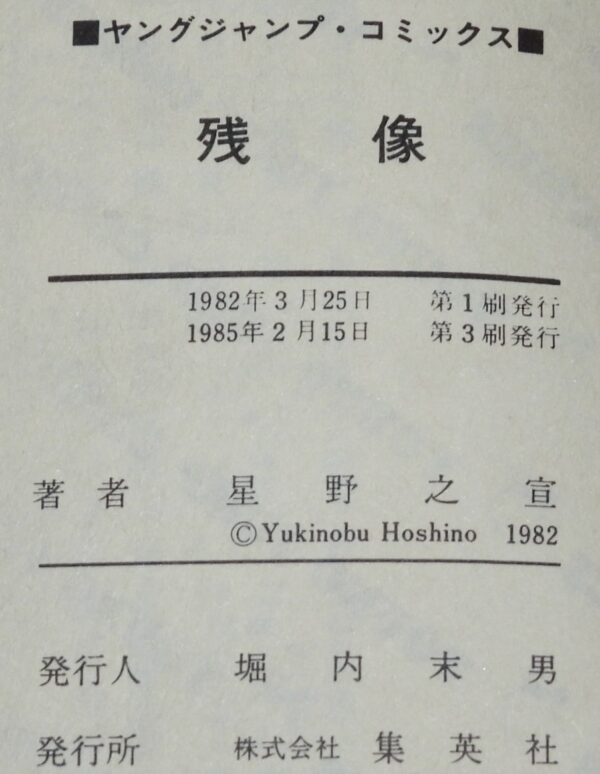 星野之宣 残像 集英社YJC 1985年2月第3刷 新書判. 「ヤングジャンプコミックス」 ■状態■並~並上 カバー少汚れシミ、少折れ目シワ、端少痛み、本文少シミ、端少折れ目、小口少ヤケシミ.