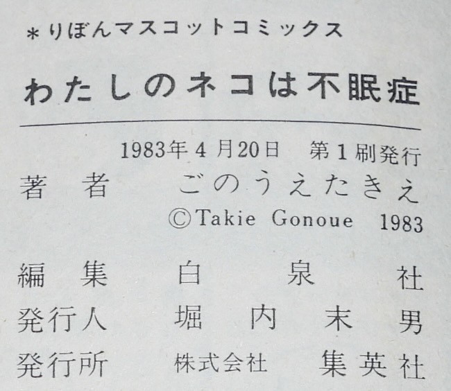 ごのうえたきえ わたしのネコは不眠症 集英社りぼんマスコットコミックス 1983年4月第1刷 新書判. ■状態■並 カバー少汚れシミ、端少痛み、少背ヤケ、本文少シミ、端少折れ目、小口ヤケシミ.
