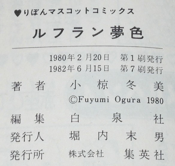 小椋冬美傑作集3 ルフラン夢色 集英社りぼんマスコットコミックス 1982年6月第7刷 新書判. ■状態■並 カバー少汚れシミ、端少痛み、本文少シミ、端少折れ目、小口ヤケシミ.