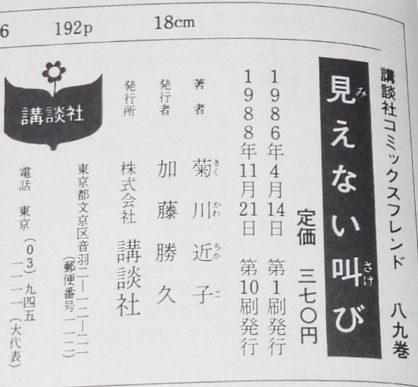 菊川近子 見えない叫び 講談社KCフレンド 1988年11月第10刷 新書判. ■状態■並 カバー少汚れシミ、端少痛み、本文少シミ、端少折れ目、小口少ヤケシミ研磨.