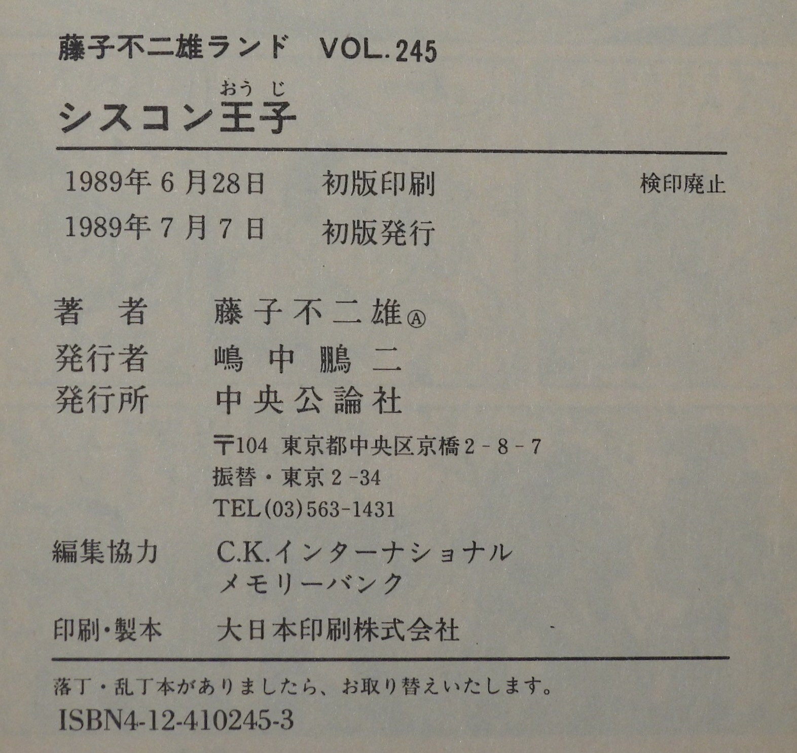 藤子不二雄ランド シスコン王子 全1巻 中央公論社 1989年7月初版 B6判.