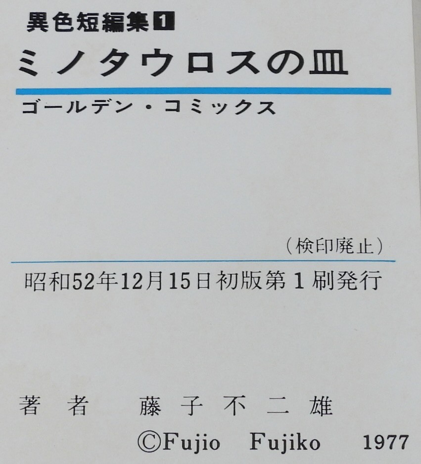藤子不二雄異色短編集1 ミノタウロスの皿 小学館ゴールデンコミックス 昭和52年12月初版 新書判. ■状態■並~並下 カバー少汚れシミ、少折れ目シワ、端少破れ、背ヤケ、本文少シミ、端少折れ目、小口少ヤケシミ、天印あり.