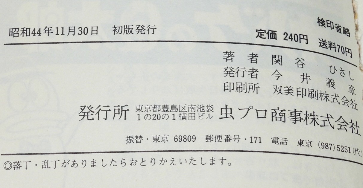 関谷ひさし 少年No.1(1) 虫プロ商事・虫コミックス 昭和44年11月初版 新書判. ■状態■並 カバー少汚れシミ、少折れ目シワ、端少破れ、少背ヤケ、本文少シミ、端少折れ目、小口ヤケシミ研磨.